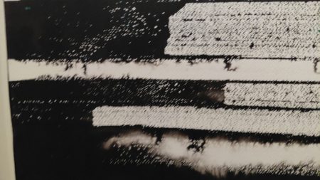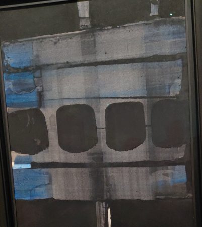 L’exposition présente des papiers marouflés sur toiles. Ordre chronologique, on peut deviner l’évolution du travail. Bou de noix, gouache noire, encre. Peinture abstraite : ne pas chercher d’intention, les titres donnent une date, et les dimensions de l’œuvre. Rien pour guider le regardeur qui se fera son interprétation personnelle. Ou pas.