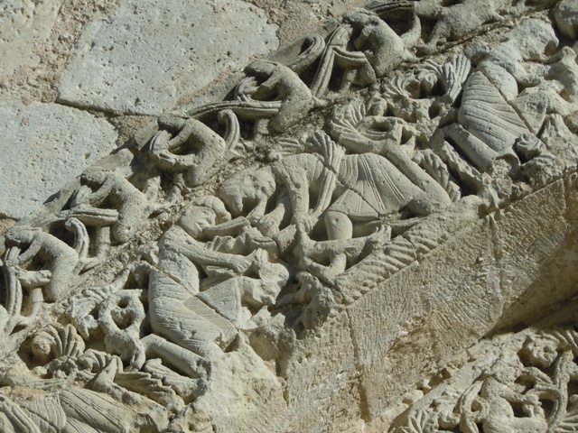 porche de l’abbatiale de Vertheuil, des paysans et vignerons à la place des saints et des anges