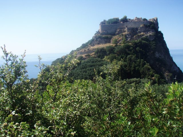 Plus loin, le château d’Angelokastro coiffe un éperon rocheux.