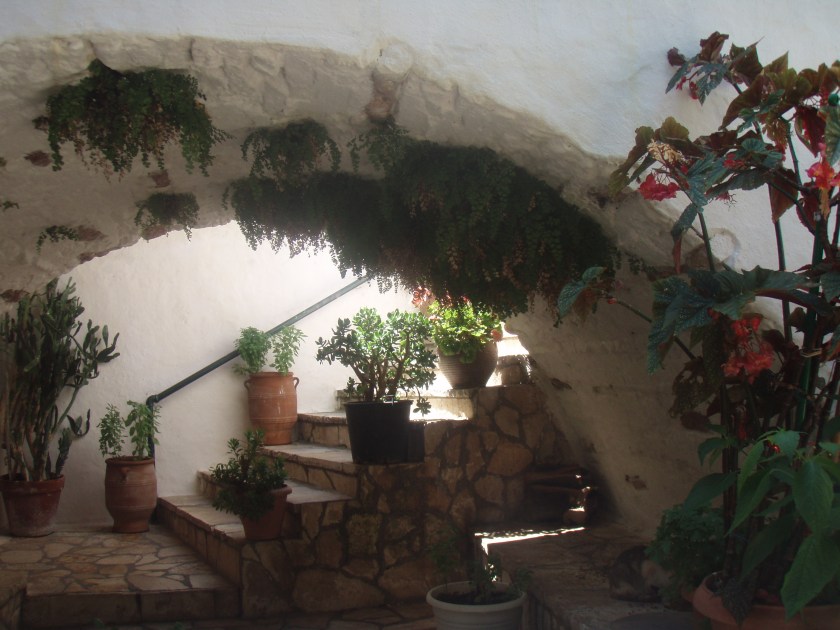 Dans une pièce sombre on peut voir un pressoir à huile qu’on vend à un prix raisonnable avec des sachets d’aromates. Qui vit ici ? Des moines ou des nonnes ? Je ne croise aucun religieux. Un passage voûté est décoré de potées de bégonias et de fougères et basilic, pavé de galets le chemin conduit au petit musée recelant des icones fort belles. J’aurais aimé prendre mon temps pour les contempler si deux groupes russes ne remplissaient pas toute la pièce déjà fort encombrée par une vitrine contenant des ossements de baleine.