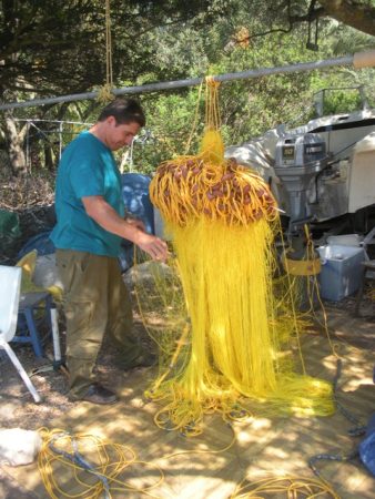 La route monte raide dans la colline, quelques kilomètres plus loin, nous découvrons la petite anse au pied des oliviers et le petit port de pêche de Sarakiniko. La route contourne une magnifique propriété au nom italien : balcons, arcades blanches, vue imprenable, terrasse, grillages, interdit de pénétrer(on n’y aurait même pas songé). Le ruban d’asphalte s’arrête net(pas nous, la voiture saute une marche et cogne sur une pierre)=. Enfouie dans la verdure, une maison semble inhabitée mais encombrée d’un fouillis d’articles de pêche ou de plage. A l’ombre d’un buisson, un pêcheur coud son filet jaune. Des chaises abandonnées traînent sur la plage. Cinq ou six bateaux de pêche se balancent. Deux voiliers de grande taille paraissent abandonnés, la peinture défraîchie. J’enfile sandalette et masque. Enfin, des poissons de toute taille et couleurs, un banc de minuscules alevins bleus m’entourent, des poissons de sable broutent le fond. Je distingue une forme grise allongée, je passe au dessus jusqu’à ce qu’elle me gratifie d’un regard. On dirait une murène, est-ce possible ? L’enchantement ne durera qu’un moment. Les voitures affluent. Une famille allemande puis un couple avec deux chiens minuscules, puis d’autres encore… Il semble que les habitués cachent leur équipement autour de la maison. Nous ne les avons pas vus sortir des voitures parasols, matelas canots gonflables qu’ils traînent sur la plage.