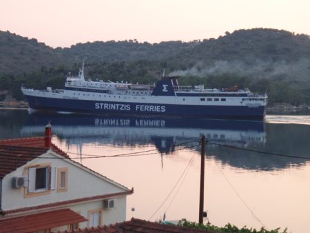 Au fond de la rade, le gros ferry Kefalonia qui nous a emmenées ici, est enrubanné. Sa guirlande d’ampoules a une allure festive, réjouissante. A 7h il se réveille à grand bruit et doit manœuvrer entre les carapaces pointues,, fend la baie de Vathy faisant vibrer toute la ville. L’eau reste agitée longtemps après que son sillage ait disparu. Elle est pailletée de l’or du ciel de l’aurore tandis que l’ombre de la montagne est vert foncé. Dans cinq minutes précisément le soleil émergera juste en face rayonnant et je serai éblouie.
