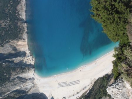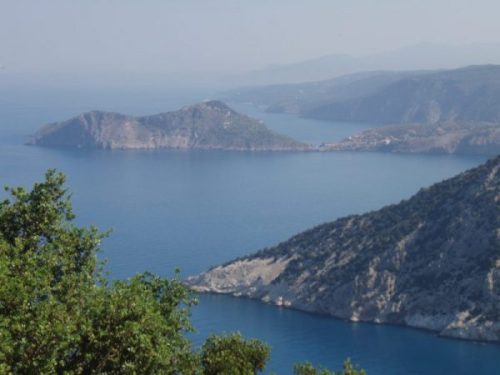 Dans le creux, entre la presqu’ile et Céphalonie, le long de la digue se tassent des maisons colorées. La presqu’île montagneuse est coiffée d’une citadelle. Bien à l’abri, une marina et une minuscule plage tout autour de la baie de beaux, trop beaux, trop chics restaurants. Les maisons sont toutes trop neuves, trop belles, trop décorées de poteries vernissées. Elles abritent des studios à louer pour les touristes. Cela doit être agréable d’y passer un week-end. Mais c’est trop joli, pas naturel.