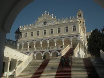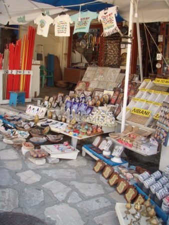 Du port, une rue en pente très raide conduit à la Panagia, l’église mariale. Contre le trottoir court un tapis grisâtre. Les boutiques ne vendent qu’une variété d’articles : icônes et cierges de toute taille très fins, rouge, jaunes et beiges (le plus grand fait près de 2m et coûte 6€). La rue parallèle piétonnière est beaucoup plus animée avec des boutiques plus variées et colorées : toujours des icônes, de l’encens de tout parfum et de toute couleur et origine. Celui de « Smyrne » ressemble à du granite altéré, grisâtre avec des cristaux blancs.