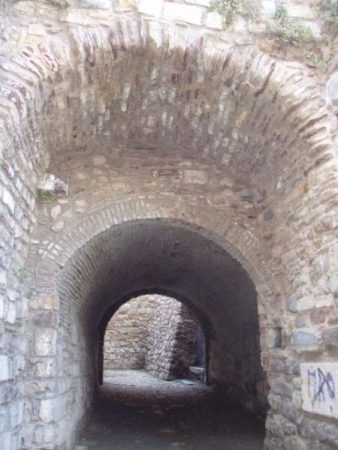Nous traversons les villages de la Région du mastic. Olympi est un village fortifié très différent de Pirgi. Les maisons son en pierre grise, cubiques, ramassées les unes contre les autres autour du donjon, enfermées dans les murailles. Les ruelles étroites passent sous des arches. Tout était conçu pour la défense du village en cas d’attaque des pirates. Aujourd’hui c’est un village très tranquille. Une dame armée d’une tapette à mouches me conseille :