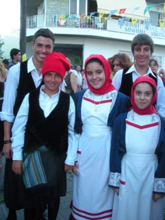 Puisque nous sommes venues, nous allons attendre la procession qui se prépare pendant l’office. Les soldats, debout au garde-à-vous. La fanfare est prête. Des adolescents en costume folklorique font leur apparition. Les garçons en gilet de velours sarouel, bas noirs et ceinture large en tissus. Ils sont coiffés d’un bonnet rouge à gland, sorte de fez mou. Les filles en longues jupes et corsages blancs. On noue sur leur tête des fichus rouges exactement de la même manière que le voile des femmes turques, les cheveux cachés, le cou et le front pris dans le tissu. Si on montrait cela aux adolescentes de chez nous qui prennent le voile pour une manifestation identitaire, peut être déchanteraient elles ? Rien d’islamique dans ce fichu des grecques orthodoxe pourtant la même coiffure !
