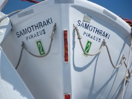 Le Samothraki est un grand bateau bleu moins élégant que le Ierapetra. Il a deux niveaux de cales à voitures et le pont supérieur est au 8ème niveau. Les ponts ne sont pas aménagés pour un séjour prolongé- le plus haut est équipé de rangées de sièges en plastique mais n’a pas d’auvent,sur celui du dessous les chaises sont fixées le dos au paysage, au niveau des canots de sauvetage il y a de l’ombre mais pas de siège. En revanche les salons sont vastes et luxueux. Fauteuils beiges en cuir ou simili cuir, canapés profonds, tables avec des chaises de bistro ou fauteuils d’avion. Nous préférerions rester à l’extérieur mais il faut choisir : assis au soleil ou debout à l’ombre.