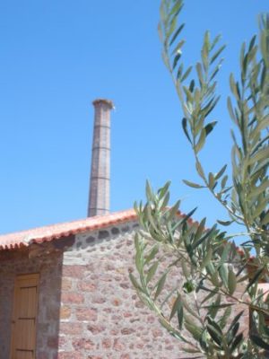 Après la saline, nous bifurquons à gauche et arrivons rapidement au village d’Aghia Paraskevi (encore une confusion ! Aghia m’avait fait penser à une église – c’est le nom du village). Le monument historique est bien indiqué, pavoisé aux couleurs de la Grèce et de l’Europe. C’est le Musée de l’Huilerie Industrielle de Lesbos installé dans un groupe de bâtiments en pierre de lave et briques mêlées. Rien à voir avec les pressoirs à huile artisanaux traditionnels.