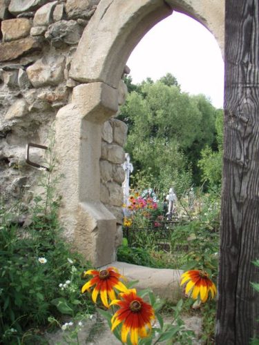 Comme souvent, on appelle monastère, en Roumanie, une église dans un enclos même si les bâtiments monastiques ont disparu. Une belle porte surmontée d’une tour nous accueille. L’église blanche, coiffée d’ardoises avec sa tourelle au chapeau pointu est plus simples que celles que nous avons vues en Bucovine. Seule décoration : des assiettes émaillées. L’intérieur est lugubre, les parois noircies par la suie, quelques lampes à hile, quelques cierges devant les icones pour tout éclairage. Quand nous partons, un pope accourt, fait un grand détour pour nous éviter, saute une barrière et arrive en courant. Il veut voir nos photos.