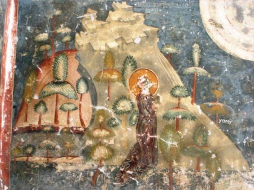 Nous avons payé une taxe photo pour les extérieurs sans aucune restriction. Le programme des fresques est un peu différent : la paroi nord est très bien conservée. Elle est occupée presqu’entièrement par ‘Echelle des Vertus (Evasion) ou Echelle Spirituelle (D. Fernandez). L’échelle à trente degrés partage selon la diagonale l’espace entre le ciel où volent les anges qui portent les rouleaux avec la liste des bonnes actions tandis qu’au dessous les démons attirent les pêcheurs et cherchent à les faire tomber. Evidemment, les démons sont rigolos : ils ont des visages grimaçants sur le ventre et des ailes courtes en éventail.