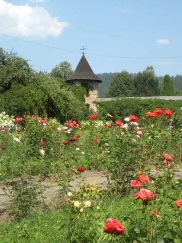 Le jardin est soigné. Les moniales s’activent autour des buissons de roses, arrosent les bégonias. Déjà, le soleil baisse. C’est un endroit calme et charmant. Nous restons un long moment à écrire et à lire assises sur un banc. De temps en temps, à court d’idée, je scrute les personnages des façades à la jumelle. C’est notre troisième visite de monastère en deux jours. J’aime bien être capable d’identifier des personnages mais notre curiosité est un peu émoussée. Voronet reste notre préféré.