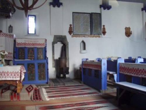 Une flèche « Monument » nous guide vers un petit porche surmonté d’un auvent avec une pointe très aiguisée et un toit de tuiles vertes de mousse. La barrière a été repeinte récemment .Les inscriptions sont en hongrois. Le jardin qui entoure l’église est très joli avec ses bancs bleus, ses buis et troènes taillés, ses rosiers entourés d’un rond de pierres chaulées. Une glycine accueille les visiteurs qui passent par un petit porche sans intérêt. L’église est fermée. Par un carreau on peut découvrir cette très jolie église unitarienne. L’autel est une table rustique sculptée recouverte d’une nappe brodée au point de croix avec des motifs rouges sur fond grège, fleurs et oiseaux. Une armoire verte est peinte. La chaire en pierre est ornée de tissu brodé, au dessus le bis sculpté est peint en bleu et vert. Les bancs et les dossiers sont également en bois peint en bleu. Sur chaque dossier, un livre de prières et des bandes de broderie. Au sol, un tapis rouge-noir-beige aux dessins en losanges. A l’extérieur l’église est encore blanche et bleue. Sous un auvent de travers un « totem » sculpté porte les couleurs hongroises, des rubans verts-blancs-rouges.