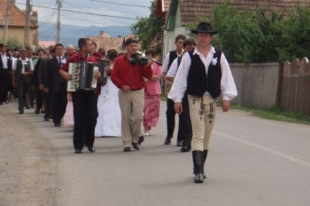 Intermède : un cortège nuptial suit des musiciens, le maître de cérémonie, seul à l’avant suivi de trois violoneux des accordéonistes et des mariés en costume modernes. La mariée toute jeune me sourit quand je la prends en photo porte une robe blanche courte. Tout le village suit en une longue colonne.