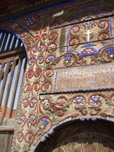 La route vers Odorhieu Secuiesc franchit des collines verdoyantes. Au creux d’un vallon, un chapelet d’étangs : l’un est une réserve ornithologique, le suivant organisé pour la pêche. Nous remarquons les portails ciselés de plus en plus nombreux et les inscriptions en Hongrois. Les petites églises blanches avec les maisons blotties forment des taches rapprochées dans les vallées. On peut voir ensemble trois ou quatre églises à la fois.