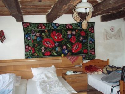 Adrian nous accueille. Il déclare que nous mangerons chez lui mais nous installe dans une autre maison à l’écart. Beau portail, façade jaune repeinte à neuf. La cour n’est pas pimpante, toute couverte d’herbes. Les briques de la maison sont à nu. La cuisine est meublée d’éléments modernes sauf qu’il manque le principal : la cuisinière ! La grande salle a trois lits modernes anachroniques dans un décor ancien : tapis anciens, tissus brodés, ancienne suspension poutres soutenant des planches à peine équarries. On se croirait dans un éco-musée. Pour ajouter à la bizarrerie, il y a des prises électriques partout, un frigo et même une bouilloire électrique mais pas de courant.