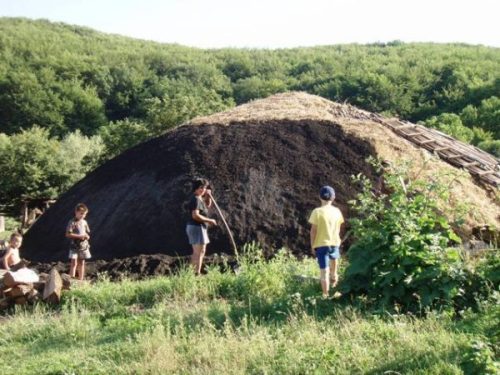 Ils ont couvert de paille le bois et sont en train d’enduire le tumulus d’une croûte de boue qui ralentira l’incendie. La femme nous montre une porte pour l’air nécessaire à la combustion. L’ensemble ressemble à une tombe étrusque ou à un dolmen infernal.