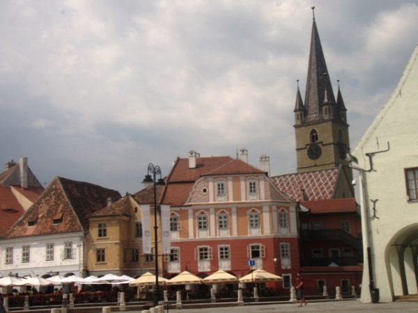 De la place Aurarilor, un escalier entre de belles maisons roses nous mène Place Mica (petite) qui est très vaste bordées de belles terrasses de café. Un bâtiment vert amande abrite la Maison des Arts (Casa Artelor) qui était en 1370 la Halle du Marché. Les belles demeures forment une galerie d’arcades colorées. De tours coiffées d’un bulbe se détachent sur le ciel encore bleu.
