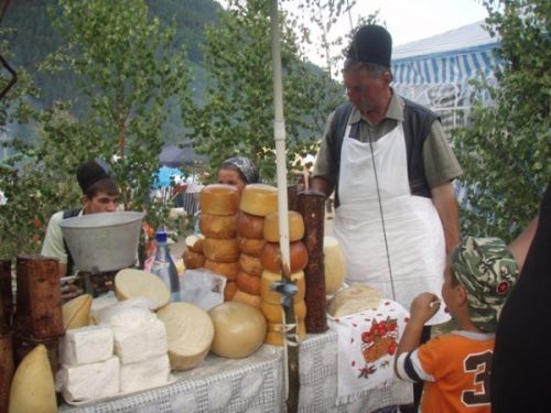 Dans la poussière, je n’ai pas le loisir d’admirer toutes les maisons de la très longue rue aux façades multicolores et aux belles portes. Après trois bons kilomètres, j’arrive aux remontées mécaniques (Deux antiques téléskis) et à un cirque herbu. Plus loin, des attractions de fête foraine : autos-tamponneuses, manèges…Des stands de fromages pains d’épice fantaisie, chapeaux, chaudrons, ceintures… Et surtout de petits restaurants de plein air.