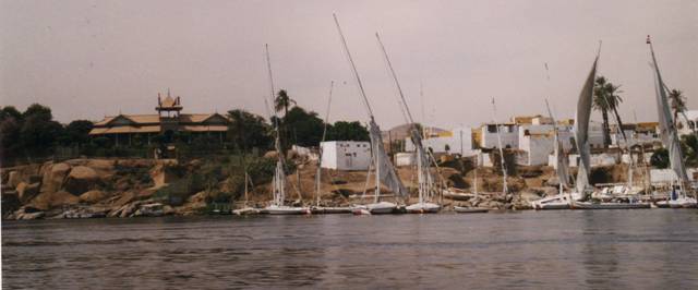 Le parc botanique occupe toute l’île Kitchener. Il est parcouru par trois longues allées bordées de palmiers variés à troncs lisses et blancs comme des colonnes. Sur la rive faisant face à l’île Eléphantine les bougainvilliers sont en fleur. A l’intérieur du parc poussent des arbres immenses d’essences inconnues : deux d’entre eux portent une floraison rouge vif. Quand les fleurs tombent à terre elles font du bruit. On en ramasse une, son calice est dur et ressemble à un demi citron vert, la corolle de pétales charnus de 7 à 8 cm de long, les étamines forment une brosse épaisse. Des Egyptiens pique-niquent en famille. Nous nous attarderions volontiers si notre bateau ne nous attendait pas au sud de l’île. De gros blocs de granite affleurent formant de nombreux îlots portant des chaos rocheux ou des roseaux. Nous passons devant des hérons ou des aigrettes . C’est vraiment un batelier très agréable ! Nous prenons rendez vous pour demain matin 8 heures.