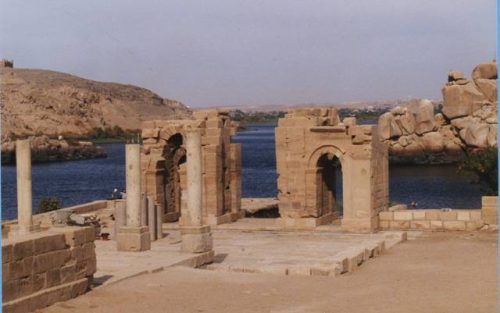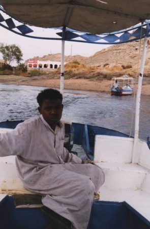 L’embarcadère pour Philae se trouve proche de l’ancien barrage. Un homme âgé joue l’intermédiaire, il lui manque des dents et des doigts mais il fait autorité sur tous les bateliers. Comme nous avons baissé le prix, il nous confie à des gamins : le moteur de leur barque est à moitié démonté, ils tirent sur une ficelle sans réussir à démarrer. Le « chef » se désintéresse de notre sort. Heureusement un autre gamin vient à la rescousse, nous changeons de bord sous les regards furieux des enfants. Notre petit capitaine pourrait être élève de 5ème ou de 4ème, sa peau est très brune, son sourire éclatant. Il porte une galabieh beige et se prend au sérieux. D’entrée il demande une cigarette. Il nous attendra jusqu’à 16 heures.