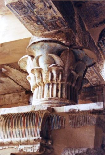 Nous redescendons à flanc de montagne dans les tombes avec de curieux pyramidions et dans le village et le village en ruines jusqu’au temple d’Hathor complètement caché par un mur de briques de terre crue bizarrement ondulé. Le temple est tout petit mais en très bon état. Il a gardé son plafond, ses colonnes campaniformes d’un très joli bleu turquoise et ses fresques dans les trois chapelles… Il y a des têtes de vache partout, ce qui est normal pour temple consacré à Hathor, mais d’autres divinités ont une tête bovine. Le gardien nous montre la pesée des âmes avec Thot l’ibis et la Dévoreuse.