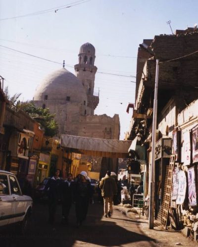 Nous suivons la rue Gamaliyya. Les maisons sont toutes anciennes et très belles .Wakkala Qatbay date de 1480, le Khanqa Baybar de 1306. Partout des balcons fermés en bois en décrochement dans la rue. Nous découvrons une mosquée. Des hommes nous dirigent vers un caravansérail tout rénové (une initiative de Suzanne Moubarak). Le vendeur de tickets essaie de nous commenter le lieu en arabe et comme on ne comprend rien il n’insiste même pas pour nous faire payer. Autour d’une cour carrée de bonne dimension des immeubles de trois ou quatre étage portent de belles moucharabieh en relief, malheureusement la restauration est trop récente, le caravansérail tout crépi de beige fait trop neuf dans la crasse noir environnante et il a perdu un peu de ses charmes du passé.
