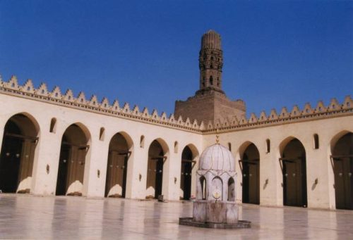 Il y règne une propreté qui contraste avec la crasse de la rue. Calme et silence, des indigents dorment sous des couvertures brunes. Une machine de nettoyage industrielle passe (incongrue ici, à l’hôtel Cosmopolitan, on balaie l’escalier au lieu d’aspirer).Les mosquées fatimides sont différentes des mosquées turques : des colonnes soutiennent le plafond mais aucun mur ne ferme l’édifice, on se déchausse donc à l’entrée de la cour dallée, un tapis traverse la cour et on se retrouve devant le mihrab sans s’en apercevoir peut être est ce un effet du climat. Sous la forêt de colonnes, l’air circule librement ; ici on ne craint ni la pluie ni les rigueurs de l’hiver. On me propose de monter au minaret .