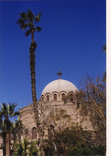 Le parvis de l’église est une sorte de hall couvert où l’on vend toutes sortes de bondieuseries, une télé diffuse un feuilleton, des affiches criardes sont placardées. Le patio serait joli avec son bassin s’il n’était pas encombré de chaises branlantes et de ferraille. Nous pénétrons dans l’église à trois nefs avec des bancs comme dans une église européenne. Magnifique plafond de bois en coque renversée où des ventilateurs à longues pales sont suspendus. L’iconostase est très belle, non couverte d’icônes comme en Grèce, mais en bois travaillé à la mode mauresque. Deux portes fermées par des rideaux de velours grenat pour la communion. Zeinab nous parle des coptes. Comme elle a appris le français dans un couvent, je pensais qu’elle était copte, non, elle est musulmane.
