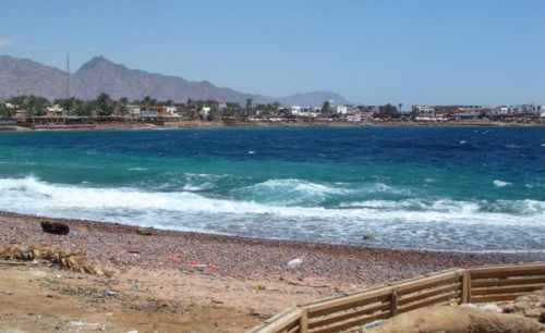Dahab est le paradis des plongeurs. Tous les eux pas, une école de plongée. Malheureusement la mer est agitée. De belles vagues blanches sont poussées vers le sud par un vent fort. Personne ne se risque dans l’eau.