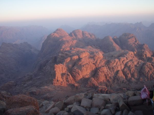 Sur le sentier, je n’ai pas parcouru deux mètres que je butte sur une grosse pierre. Ma lampe frontale éclaire trop loin devant moi et pas mes pieds. Je la prends à la main. La progression est pénible dans la cohue. Chacun pousse celui devant soi. D’autres vont à contre-courant pour retrouver leur groupe. Des Egyptiens se proposent comme guides. Ils barrent la route et gênent plus qu’ils n’aident ; Il faut les éconduire brutalement. Devant moi, une femme tire un gamin. Ils occupent tout le sentier. Elle a mis son bâton de marche dans son sac, la pointe dirigée vers moi. Si les Espagnols derrière me poussent je vais m’empaler.