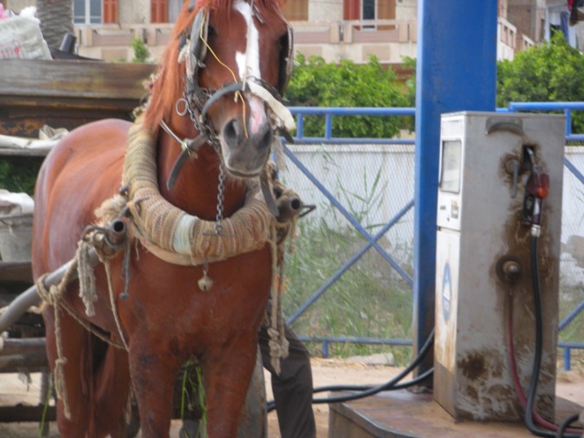 La promenade le long du Nil est gravillonnée mais il n’y a pas un arbre. Des bacs font la navette entre les deux rives. Nous sommes très près de l’embouchure et le fleuve est très large. Des jeunes nous proposent : « felouca ? »Cela me plairait mais la rive est raide et l’embarquement malcommode. Nous marchons jusqu’à une mosquée dont le minaret de brique dépasse d’un curieux bâtiment à angle aigu. Sur la corniche circulent d’antiques Chevrolet des années 50. Comme celles de cuba, elles ont subi des rafistolages, des réparations de carrosserie très artisanales et une peinture bleue pas forcément appropriée. Les chevaux sont plus nombreux que les Chevrolet, concurrencés par les taxis locaux : des Lada branlantes jaunes et vertes.