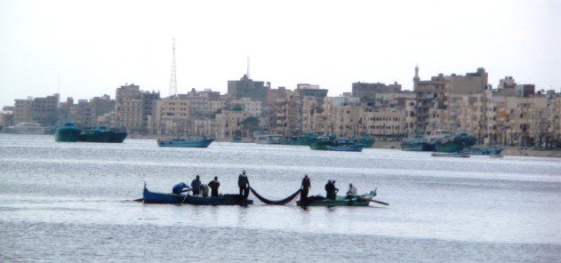 Des pêcheurs ont jeté un filet dans le Nil. Ils sont 9 répartis sur deux embarcations qui se rapprochent pour tirer le filet et s’écartent pour tracer un cercle.