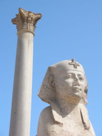 Il faut lire l’histoire de cette colonne énorme, de 30 m de haut et 9 m de circonférence, pour trouver un certain intérêt à une colonne isolée. D’abord, elle n’a de Pompée que le nom (arabisé cela donne quelque chose comme Bombay) puisqu’elle fut érigée en l’honneur de Dioclétien et appartenait au Serapeum. Le Serapeum est un exemple de syncrétisme faisant du dieu égyptien Apis un Sérapis romain. Tout autour, des excavations montrent les restes de l’annexe de l’antique Bibliothèque qui a aussi brûlé.
