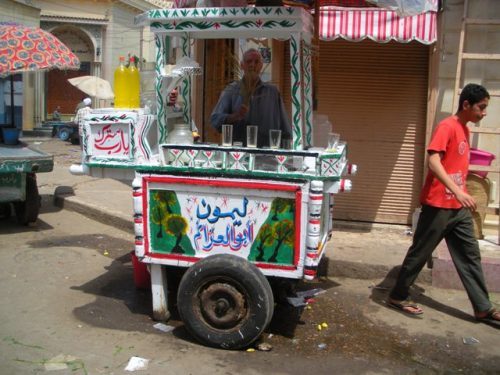 Autour de la gare, à tous les coins de rue des gargotes de taamyia, de poissons et de frites. Au milieu de la rue sont installées des charrettes aux belles roues de bois tourné peintes de couleurs qui ont été vives autrefois et qui s’écaillent. Les légumes sont magnifiques : courgettes fraîches, aubergines violettes ventrues, artichauts, bottes de navets avec leurs fanes, haricots verts, pois, tomates et concombres. Les fruits aussi sont appétissants : grosses oranges, petites limettes, goyaves, melons, petites pêches rouges, oranges ou jaunes…