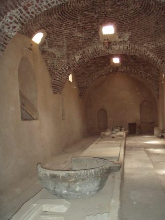 la longue pièce au plafond en coupoles de briques, est meublée seulement d’une longue table basse de pierre. Les moines mangeaient assis par terre. L’acoustique est parfaite : tous les moines, même ceux qui occupaient les places les plus éloignées, pouvaient entendre la lecture des textes sacrés. Dans ce réfectoire sont entreposés des troncs d’arbres fossiles que je photographie.