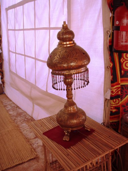 Dîner dans la grande tente doublée de satin blanc et de toile bariolée, des lampes en métal repoussé, ajourées, décorées de perles. Buffet en compagnie de deux groupes de touristes italiens : choix classique, légumes insipides et veau en sauce. Il faudrait être vraiment difficile pour se plaindre de cette gastronomie internationale : un restaurant au milieu du désert c’est déjà un miracle !