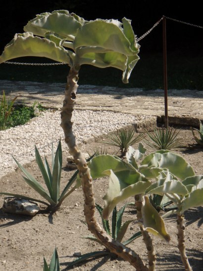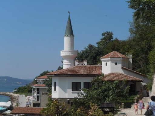 L’entrée est chère (10 levas) . Dans le premier jardin les végétaux sont regroupés par collections rangés par écosystème. Dans un intéressant ensemble d’halophytes j’apprends le nom d’une immortelle très commune et ubiquiste que nous avons rencontrée sous diverses latitudes : Armeria maritima. Cactées et succulentes doivent ici supporter la gelée, certaines résistent jusqu’à -30°. Le second jardin est beaucoup plus vaste et en pente. C’est le royaume de l’eau : bassins ronds, ruisselets, petits ponts, source miraculeuse, cascades…Des pavillons sont disposés dans le parc. Celui de Marie de Roumanie est juste en face de la plage. De style orientalisant il porte une tour en forme de minaret. Il faut suivre la foule des touristes roumains et russes qui se suivent de pièce en pièce. Peu de souvenir de la souveraine : la coupole est le hammam, quelques photos sur els murs, une collection d’icônes, un bureau. Personnalité intéressante que cette princesse anglaise, petite fille de Victoria qui épousa Ferdinand de Roumanie qu’elle n’aima pas. Les princesses ne sont pas mes héroïnes favorites mais je ferai une exception pour celle-là !