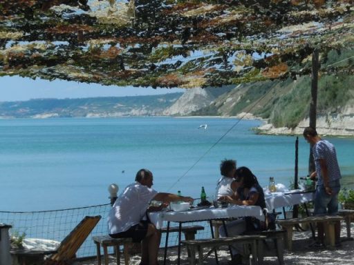 A la sortie de Kavarna la route file au nord vers Durankulak et la Roumanie. Nous la quittons et traversons le petit village de Balgarevo où on vend d’énormes melons jaunes et des pastèques dans la rue. Un panneau indique la « ferme des moules », une étroite route descend vers la mer. Pas de plage mais deux restaurant s de moules en terrasse sur le bord de l’eau. Des moules fraîches servies de toutes les manières, en cassolettes, à toutes les sauces (noix de coco entre autres), en farce pour les feuilles de vigne ou de chou, en soupe, en salade …Nous commandons une salade « Nuit romantique » servie dans un poisson de verre, tiède, petits pois crus, moules nappée d’une sauce rose. Ensuite une petite friture (10 levas) très bien servie, la portion va pour deux. Le décor est parfait : les tables sur le bord de l’eau sous un filet(camouflage militaire) qui projette des ombres ajourées sur la terre. Les falaises de Thrace sont en  calcaire tendre, la pente est adoucie par des buissons. La Mer Noire est calme et vrete. De nombreux goélands voltent et se posent. Les serveurs sont habillés en marinière à rayures. Nous admirons leur dextérité à porter les plateaux (le record 2 faitouts et 7 cassolettes d’une seule main. ). C’est vraiment un  moment très agréable.