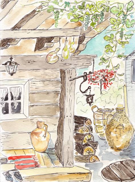 J’ai plus envie de dessiner que de faire des visites. Nous partageons le balcon avec deux femmes bulgares, mère et filles. La fille parle bien anglais. Elle est très curieuse de notre voyage, très fière que j’apprécie les villages bulgares. Elle pense que la Bulgarie a une mauvaise image dans les milieux occidentaux (elle est au contact avec des hommes d’afffaires) elle est ravie que les étrangers apprécient son pays.