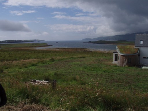 Les moutons de Skye ont l’habitude des promeneurs. Nous ne les affolons pas. Le terrain est herbu avec de petites collines. Nous sommes sur une pointe. Il y a de l’eau de tous les côtés., la vue est magnifique. Je continue jusqu’à la plage où je dérange un couple d’huîtriers pie. Je ne savais pas pourquoi ils étaient « pie ». Leurs cris affreux m’expliquent ce mystère ! Tout près, une île toute noire avec une plage toute blanche. En retournant vers la route principale un panneau nous permet de nous repérer : Harlosh à 5 miles au sud de Dunvegan.