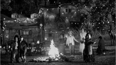 Ce n’est qu’au mitant du film que je retrouve le conte de Grimm : quand les nains qui l’ont recueillie l’appelle Blancheneige. Ces nains sont très espagnols, plutôt ceux de Goya ou de Velázquez que de Walt Disney. Leur roulotte est pittoresque. on devine qu’on verra bientôt la pomme. Mais quand? Berger a déjà pris beaucoup de distance avec la trame initiale et nous fera partager d’autres aventures espagnoles.