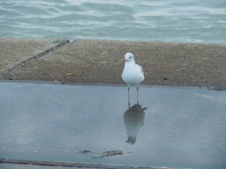 Nous atteignons directement la Pointe de Graves, et nous arrêtons au débarcadère du bac pour Royan. De l’autre côté de la route, il y a toute une série de guinguettes et restaurants simples alignés. En été, à midi, cela doit être très animé. A l’arrière se dresse la tour carrée du petit phare abritant un Musée de la Mer, fermé en cette saison. On contourne un fort militaire ancien caché dans la verdure pour arriver à une grande marina : Port Médoc. Belle vue sur l’estuaire de la Gironde. Sous une barre de nuages gris on voit bien Royan et Saint Georges de Didonne. L’église de Royan, vue de loin est belle, de près le béton brut choque un peu.