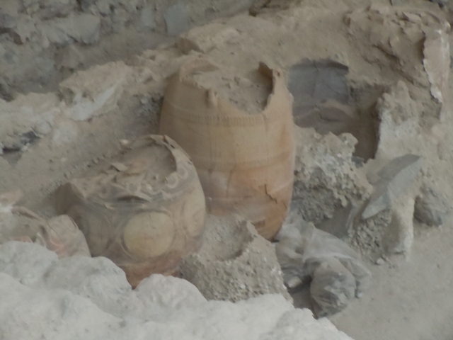 A première vue, les fouilles sont difficiles à appréhender. On ne se rend pas compte immédiatement de la profondeur des tranchées. Il me faut un bon moment pour comprendre qu’au dessous du niveau du sol actuel deux étages sont enfouis dans l’épaisse couche de téphras gris clair presque blancs. En prenant du recul on identifie les bâtiments cartographiés sur les panneaux ; Le premier XesteIV est un édifice de 20m de long, haut de trois étages. Le dallage du 3ème est encore en place. Un escalier monumental mène au vestibule. Les murs extérieurs sont en pierre de taille très soigneusement appareillés. Un guide francophone montre à son groupe un monceau de cornes de chèvres suggérant des sacrifices religieux ; Le carrefour « double horn square » présente des cornes sculptées. A l’opposé le magasin des jarres contient de nombreux pithoi remplis de marchandises. La plupart des explications des panneaux concernent les fresques qui ont été déposées dans les musées de Fira et d’Athènes.