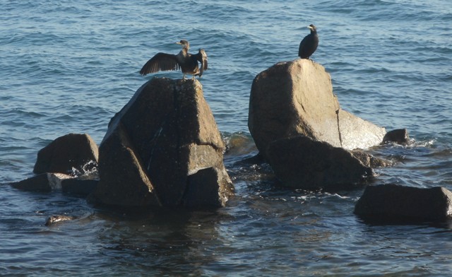 Le sentier côtier longe la plage, s’en écarte pour traverser le Creach André – hameau composé de très belles maisons – rejoint une nouvelle plage à Kersaliou. La marée est basse, l’estran est couvert de goémon et de laminaires. J’assiste aux ébats de deux bergeronnettes amoureuses qui font du vol stationnaire. Plus loin, on taille les haies, avec un énorme tracteur et une barre de coupe fixé sur un bras mécanique. Les thuyas, les romarins et les éléanus portent des blessures qui me font mal pour eux.Sur les quais de Saint Pol de Léon, le long de la baie presque fermée par l’îlot Sainte Anne et le Centre Nautique, je rencontre de nombreux joggers. Le soleil est maintenant chaud.