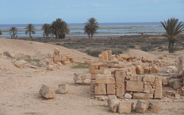 C’est une ville romaine du IIème siècle. Le site est immense, il débouche sur la mer, le golfe de Bougrara limité au loin par la côte de Djerba. Entre le site et la mer se trouve une zone basse humide avec des groupes de palmiers. Au loin les flamands roses sont alignés.