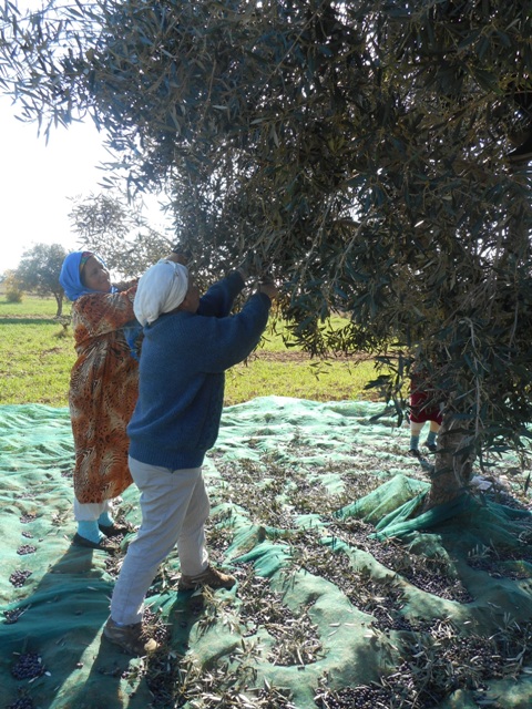 Dans les oliveraies la cueillette se fait en famille. Quatre femmes s’affairent sur un arbre ; L’une d’elle a grimpé dans la ramure. Les robes rouge, grenat orange, tranchent sur le vert de l’arbre et le vert tendre de l’orge qui pousse entre les arbres. Un peu plus loin, une vieille dame surveille  deux bébés à côté d’un attirail : bombonne de gaz, des bouilloires, des théières…On ne gaule pas les olives ici, cela blesse les branches, on ne les cueille pas non plus, on peigne le feuillage avec de petits râteaux en plastique rouge à manches très courts. Je me retrouve un râteau à la main. On attrape la branche et on peigne vigoureusement. DSCN0981 - CopieLes toutes petites olives noires tombent sur le filet dont on relève les coins pour les rassembler et trier les feuilles qui donneraient leur amertume à l’huile. Dans le Sahel (région de Sousse et de Sfax) les olives sont destinées au pressoir, elles sont très petites ; Dans le jardin de Yousr il y a aussi un olivier pour les olives de table qui sont simplmeent salées et non pas gardées dans la saumure. Elles sont délicieuses.