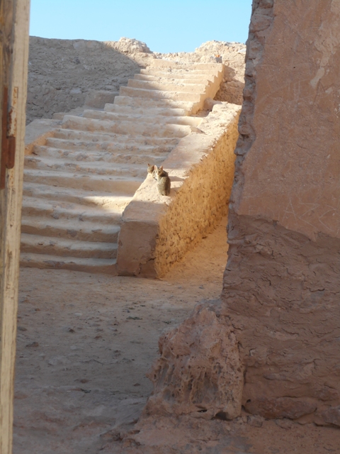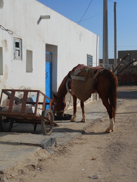 Dès que Rochdy a laissé les autres passagers il s’improvise guide à travers la belle palmeraie. Certains palmiers ont le tronc noirci : c’est la mer et le sol salé qui les a tués. Il montre aussi les troupeaux de brebis, les maisons basses aux portes bleues arquées.