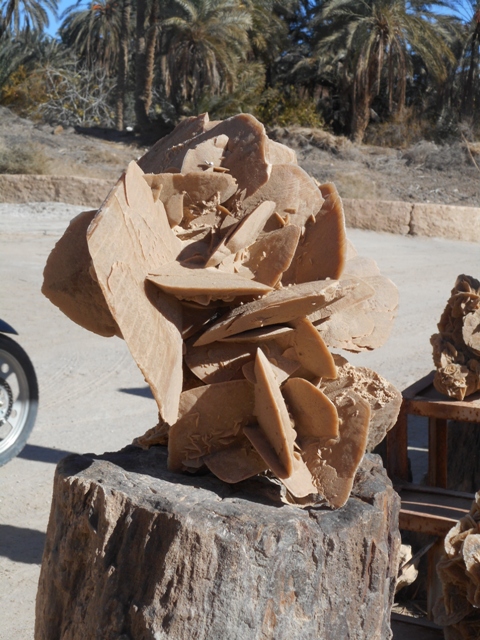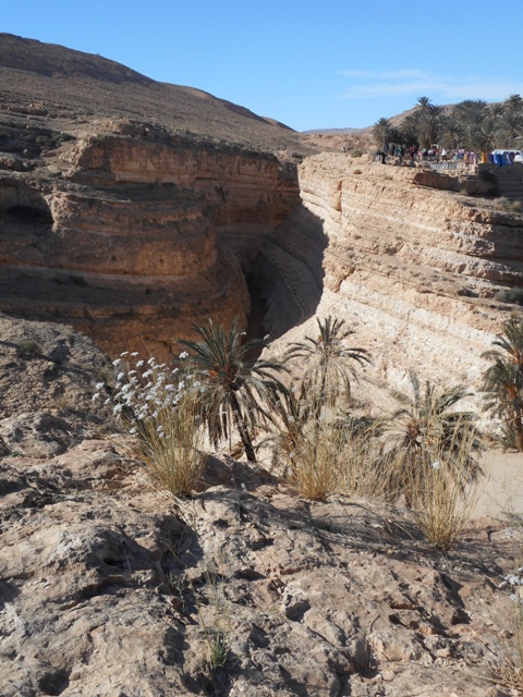 Au point de vue, des marchands ont installé leurs roses des sables, arbres fossiles, géodes. Belle marchandise très tentante. Heureusement que l’idée d’excédent de bagages dans l’avion me dissuade. Un petit ruisseau a entaillé la falaise calcaire, il prend sa source en Algérie. Nous pique-niquons de chips, Vache- qui- rit et mandarines.