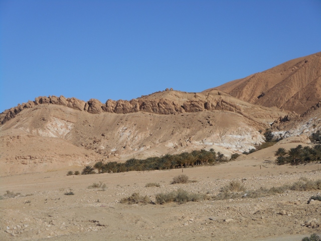 Pour rejoindre les oasis, la route traverse une plaine, très plate, encroûtée de sel. Un ruisseau court parmi les roseaux.Le sable est retenu par des clôtures de feuilles de palmiers, parsemé de buissons poussiéreux. La route est toute droite. Vers Chebika, la première oasis, blottie au pied la chaîne de montagne aux niveaux de grès rose, aux ombres violettes dans le petit matin. Un petit banc relevé à la verticale est entaillé faisant des pointes triangulaires comme les épines de la crête du dos d’un stégosaure.