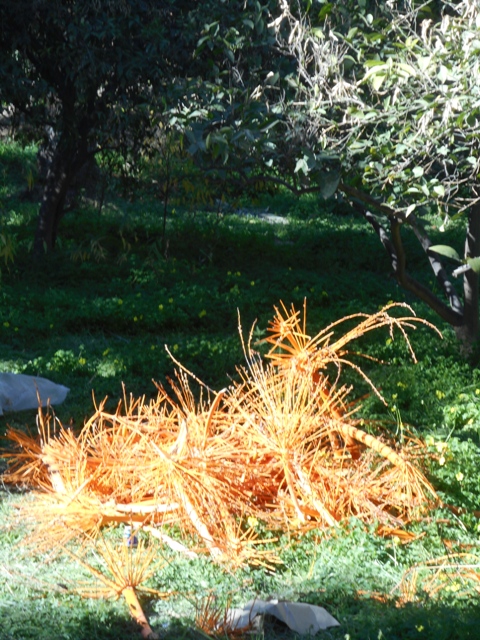 La palmeraie de Midès est très soignée. On y récolte les dattes, les branches sur lesquelles les fruits sont fixés sont orange vif qui tranche sur le vert et le jaune du tapis d’oxalis. Un homme m’offre une grenade. Je refuse mais je les photographie. La palmeraie a toujours une atmosphère spéciale, miracle de l’eau, calme et sérénité en même temps que vie et animation.